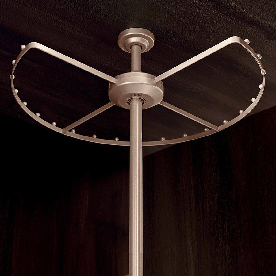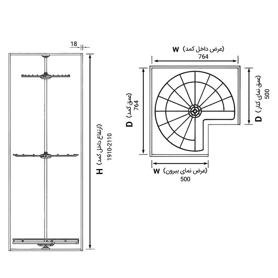 ابعاداین رک بهگونهای طراحی شده که با انواع کنجهای کمدها سازگار باشد. قطر این رک گردان 710 میلیمتر است و ارتفاع قابل تنظیمی بین 1900 تا 2100 میلیمتر دارد. همچنین، برای فضاهایی با قطر ≥764 میلیمتر مناسب است. این ابعاد، امکان نصب آسان در کمدهای مختلف با ساختارهای متنوع را فراهم میسازد و به کاربران اجازه میدهد تا با توجه به محدودیتهای موجود، بهراحتی از این اکسسوری استفاده کنند. امکان تغییر ارتفاع، نهتنها توان تنظیم آن را در سطوح مختلف داخل کمد فراهم میکند، بلکه توان استفاده از قسمت بالایی کمد را هم به کاربر خواهد داد.
